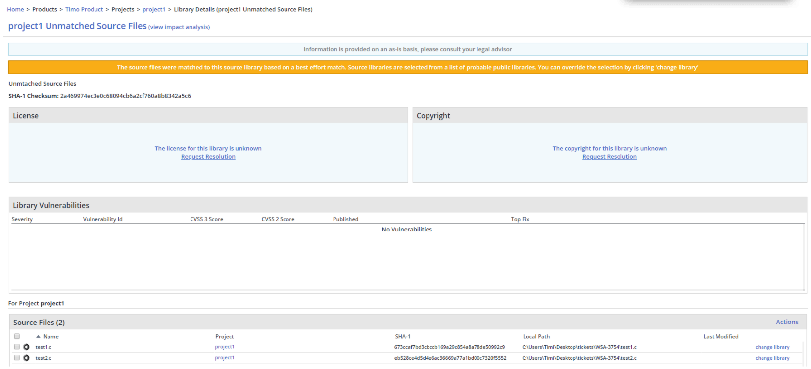 These unmatched files will be presented in the Source File Inventory Report in the Mend portal, but not in your organization's inventory report. You can always change the library of an unmatched file, and assign its license and copyrights.