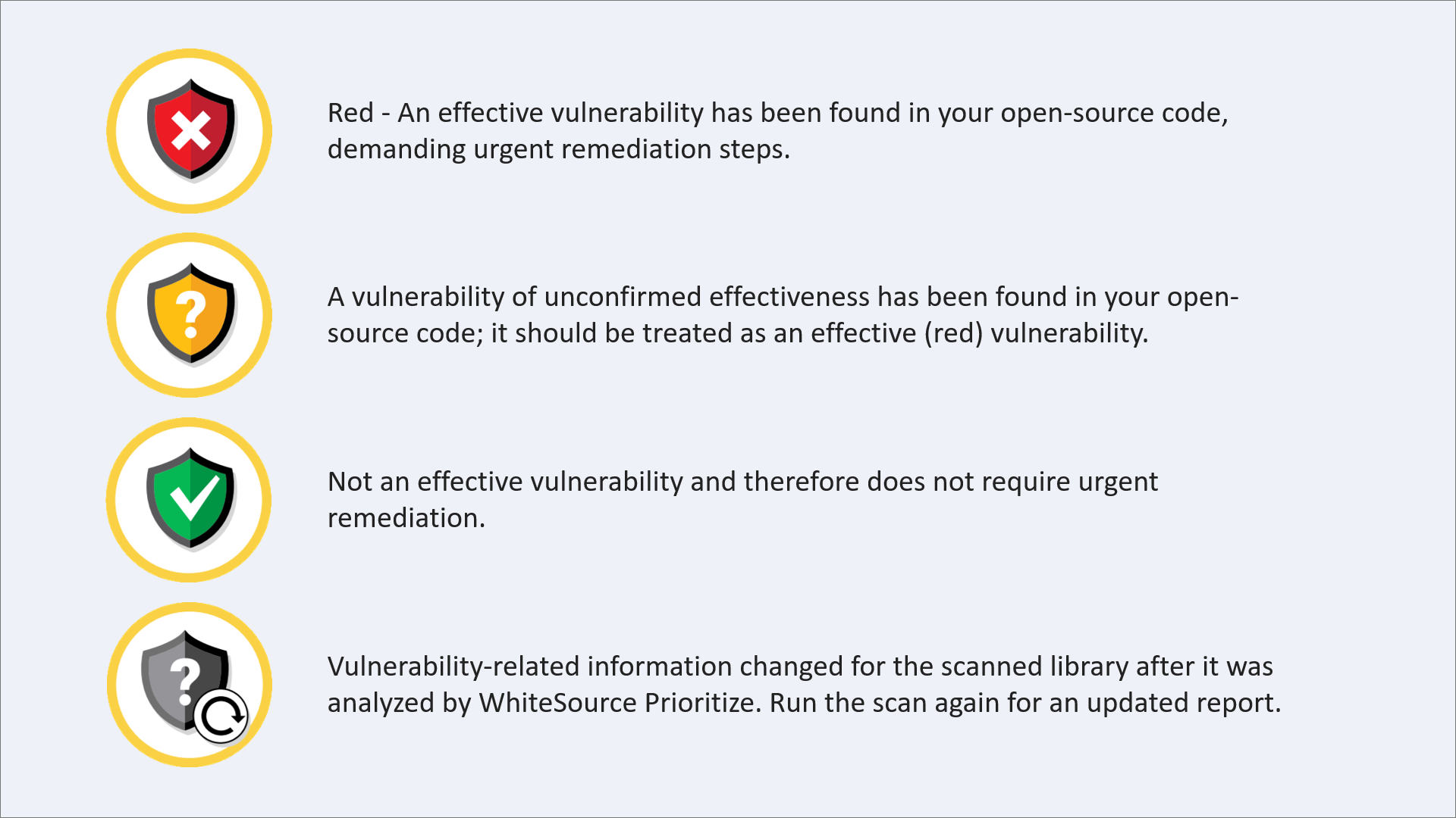 Mend Prioritize’s shield-based functionality provide clear indications of how you need to act: