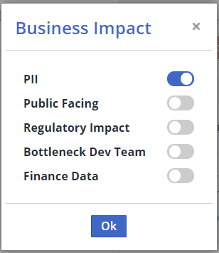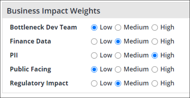 The business impact factors are Personally Identifiable Information (PII), Finance Data, Public-Facing, Regulatory Impact, and Bottleneck Dev Team.