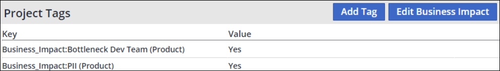 When setting a factor for a specific product, the projects under it will automatically inherit these factors. These can be overridden by navigating to the project settings and editing the business impact. Factors inherited from the product-level will have an indication in the tag key. These factors can only be overridden, and cannot be removed.
