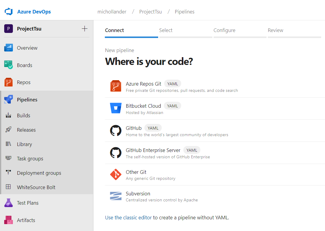 Select the source for your code. You can create a pipeline using YAML (Option 1), or use the classic editor to create a pipeline without YAML (Option 2).