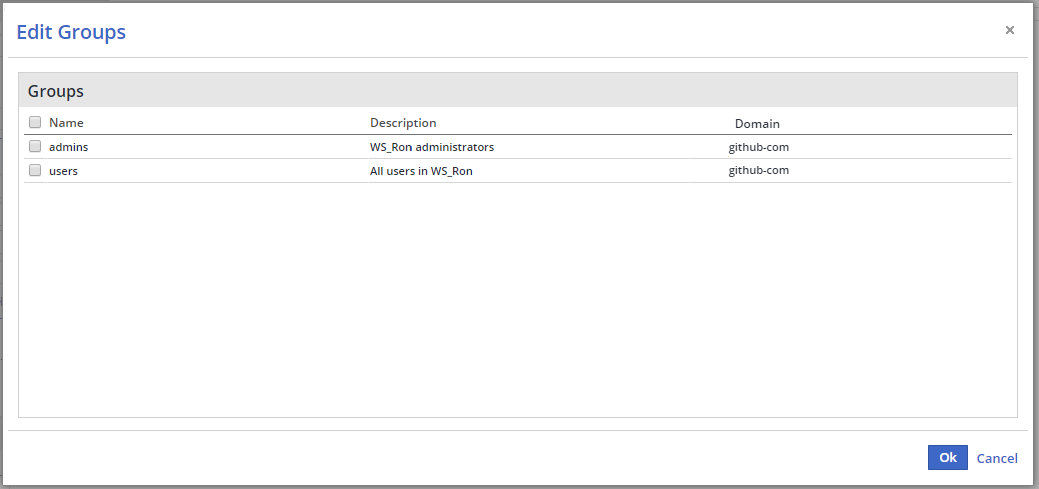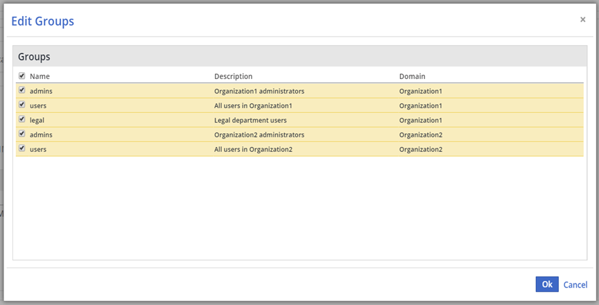 When mapping roles in the SAML Global Account method, each group is mapped to a specific Mend organization (domain). For example, in the following Edit Groups window there are two ‘users’ groups from the ‘Organization1’ and ‘Organization2’ domains. The admin should select the group assigned to the relevant domain, which should be mapped for the role that is being added.
