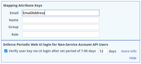 This advanced security feature enables administrators to force non-service SAML API users to log in periodically to the UI to verify that they are still part of the organization's SAML directory. If users are not able to authenticate on the UI, they will not be able to utilize their user key to make an API request.