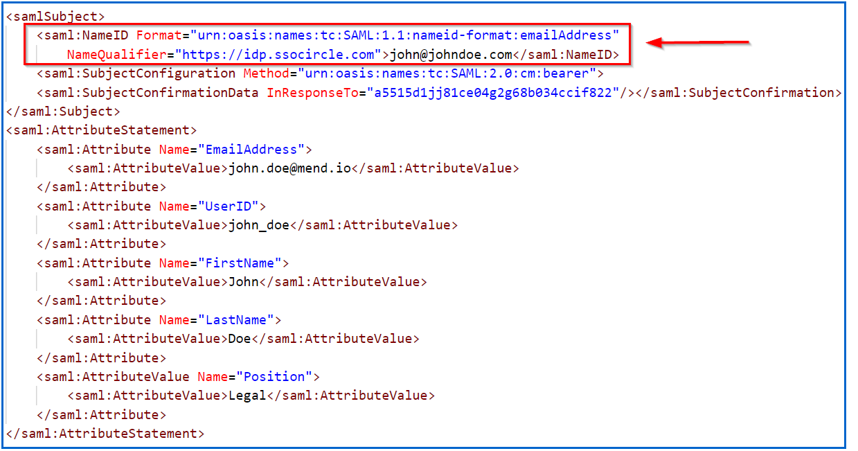 If no value is provided, the value is retrieved from the NameID attribute located within the Subject SAML attribute. An example is displayed below.