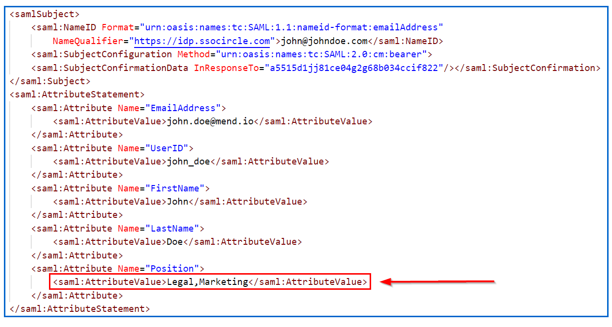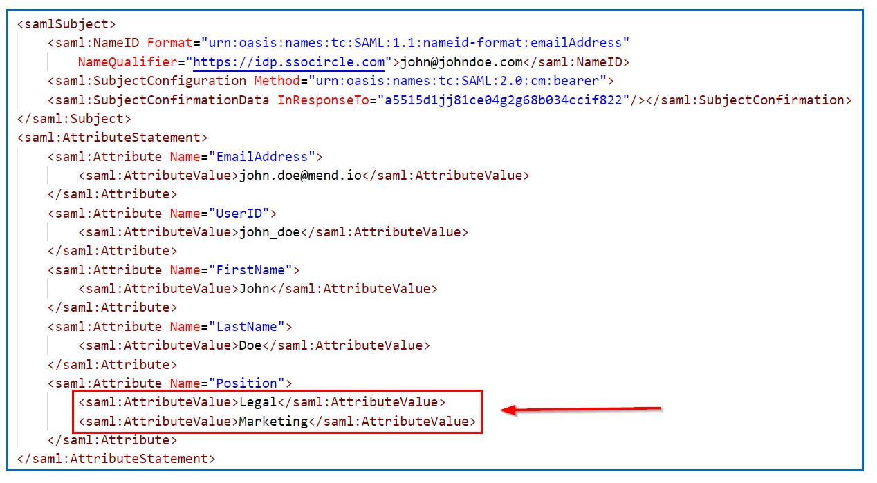 In the following SAML response, there are two values in the position attribute (Legal and Marketing):