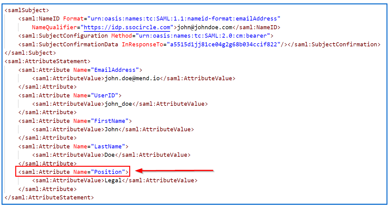 The attribute name must be identical to the name defined by your organization in the SAML response. In this example, the attribute ‘Position’ should be mapped to the Mend Role attribute key.