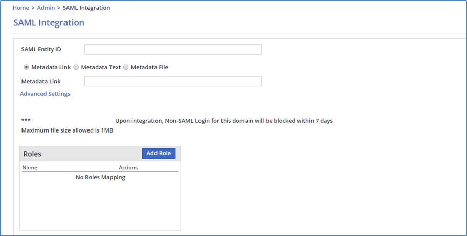 Clicking the Advanced Settings link in the SAML Integration page enables you to configure the following advanced features: