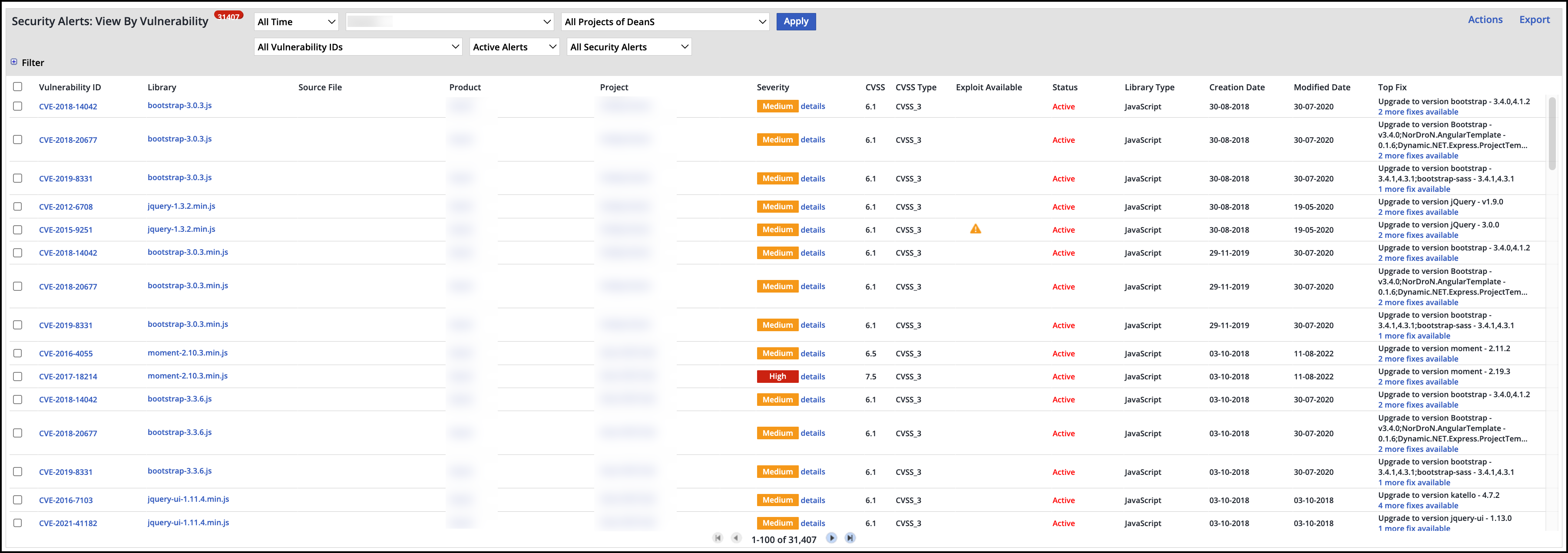 The Security Alerts: View By Vulnerability screen enables you to manage the alerts per vulnerability according to the selected products/projects. For example, use this screen to ignore alerts of a specific vulnerability across all libraries in the selected scope.