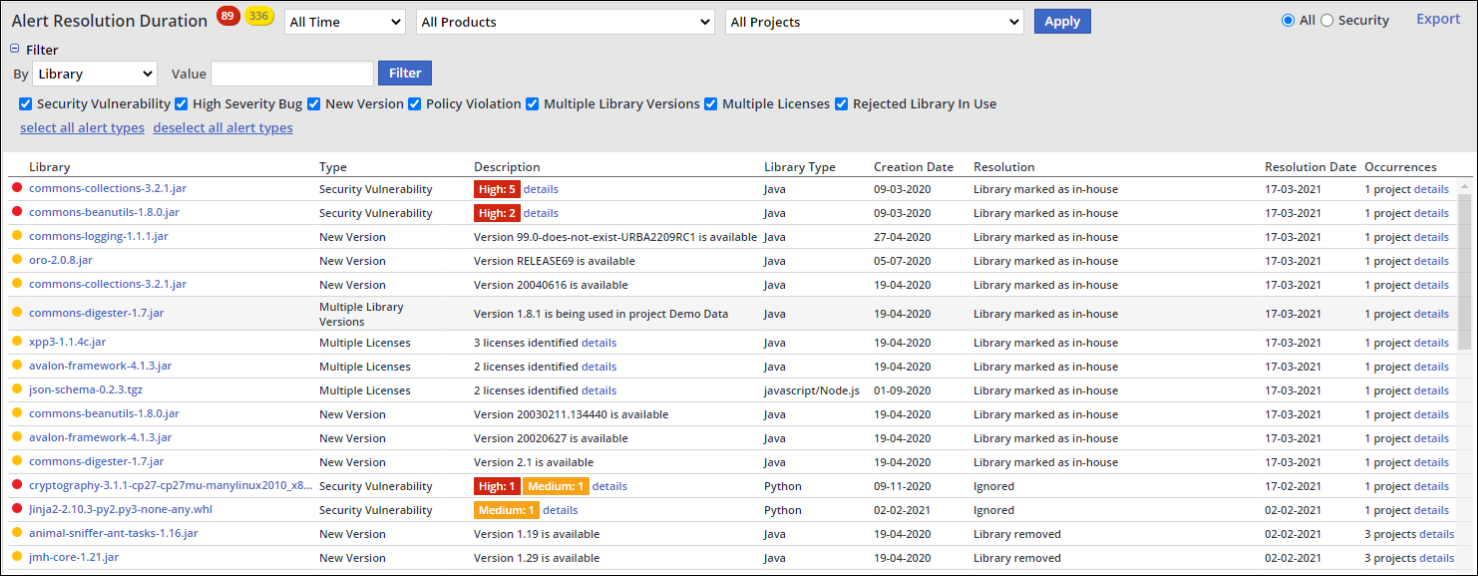 Library: Name of the open source library. Click on the library name in order to be forwarded to its Library Details page.