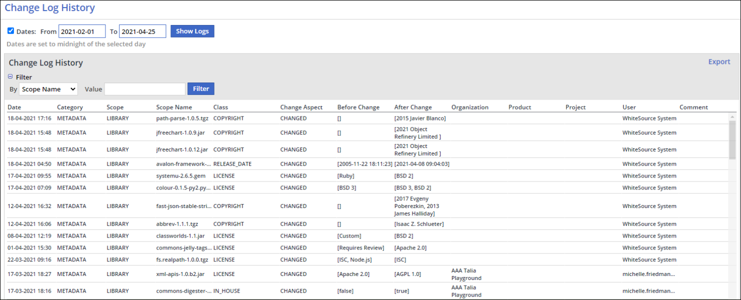 The Change Log History Report provides up-to-date details on manual changes made by Mend or its users (administrators only).