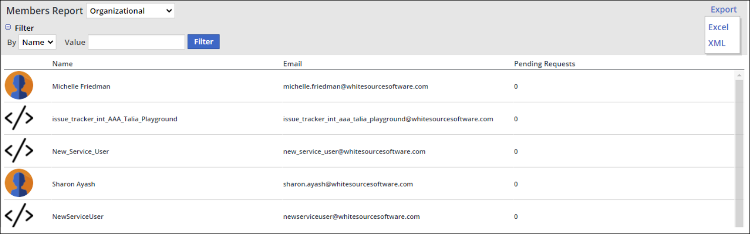 The Members Report displays the following information per organization member: