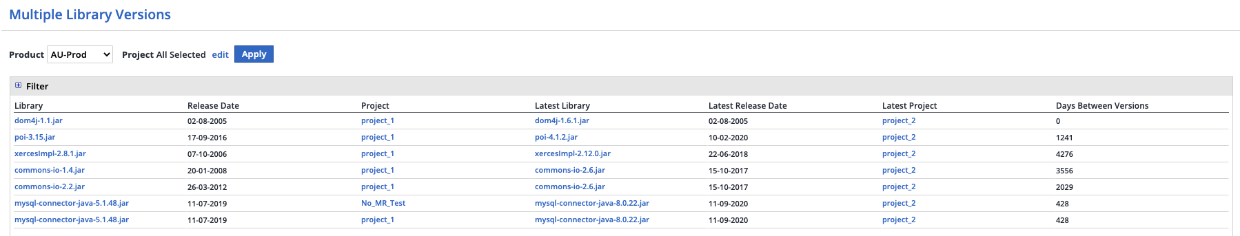 After defining all the relevant filters, the Multiple Library Versions report is displayed showing details of all the library versions for the selected product and projects.