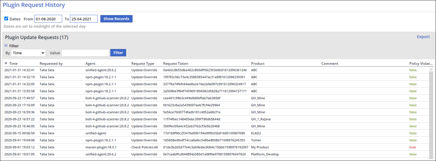 After defining all the relevant filters, the Plugin Request History Report is generated displaying all the plugin update requests.