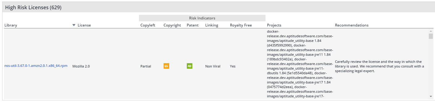This table provides details of libraries that are associated with high-risk licenses, along with indications on the risk nature and score, as well as recommended actions.