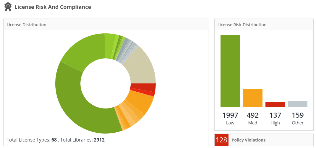 This panel also provides the License Risk Distribution, indicating the number of policy-violating libraries, and how many libraries are associated with each license (see Risk Score Rating). The Other bar refers to libraries with unspecified licenses, or licenses that have yet to be rated.