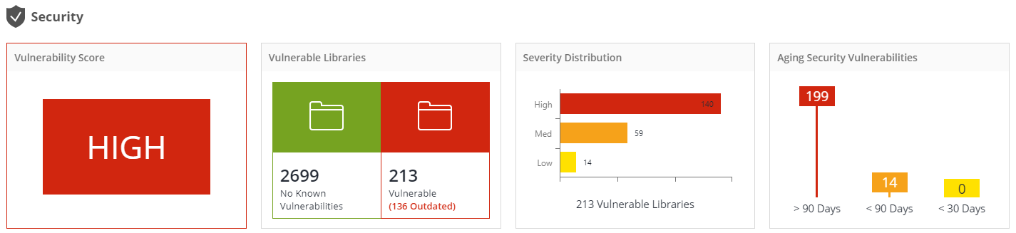 This panel displays a high-level graphic analysis of the health of your software, at organizational level or product level views. This includes the vulnerability score (base on the highest severity vulnerability), number of vulnerable components out of total components, severity distribution, aging security vulnerabilities, license risk distribution, outdated components out of total components and libraries with multiple versions.