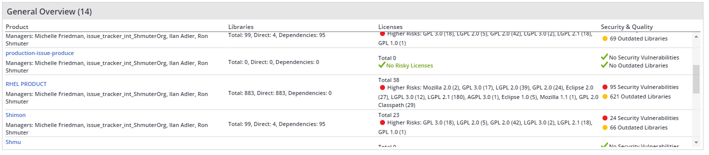This table provides an overview of Libraries, Licenses, Security & Quality per product.