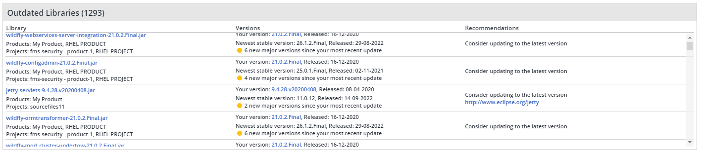 This table provides details of Outdated Libraries per product or project, their current Versions, and the recommended action to be taken for each outdated library (usually to update to the latest version). When selecting per product, the table only lists each library one time and not once per project as shown on the Product Dashboard.