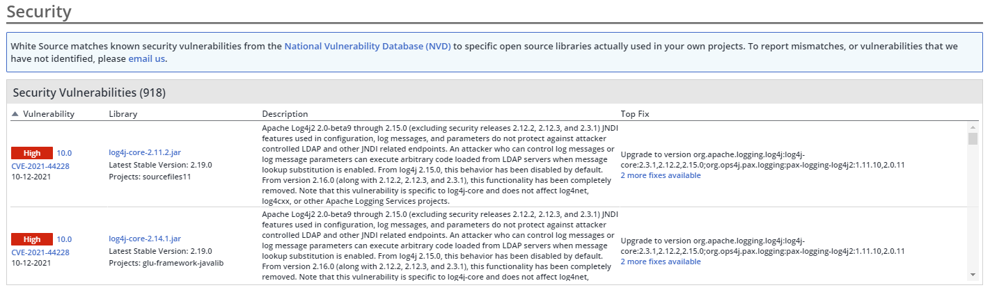 This table provides a detailed list of Security Vulnerabilities per component. For each Vulnerability, the associated Library, Description and Top Fix are displayed.