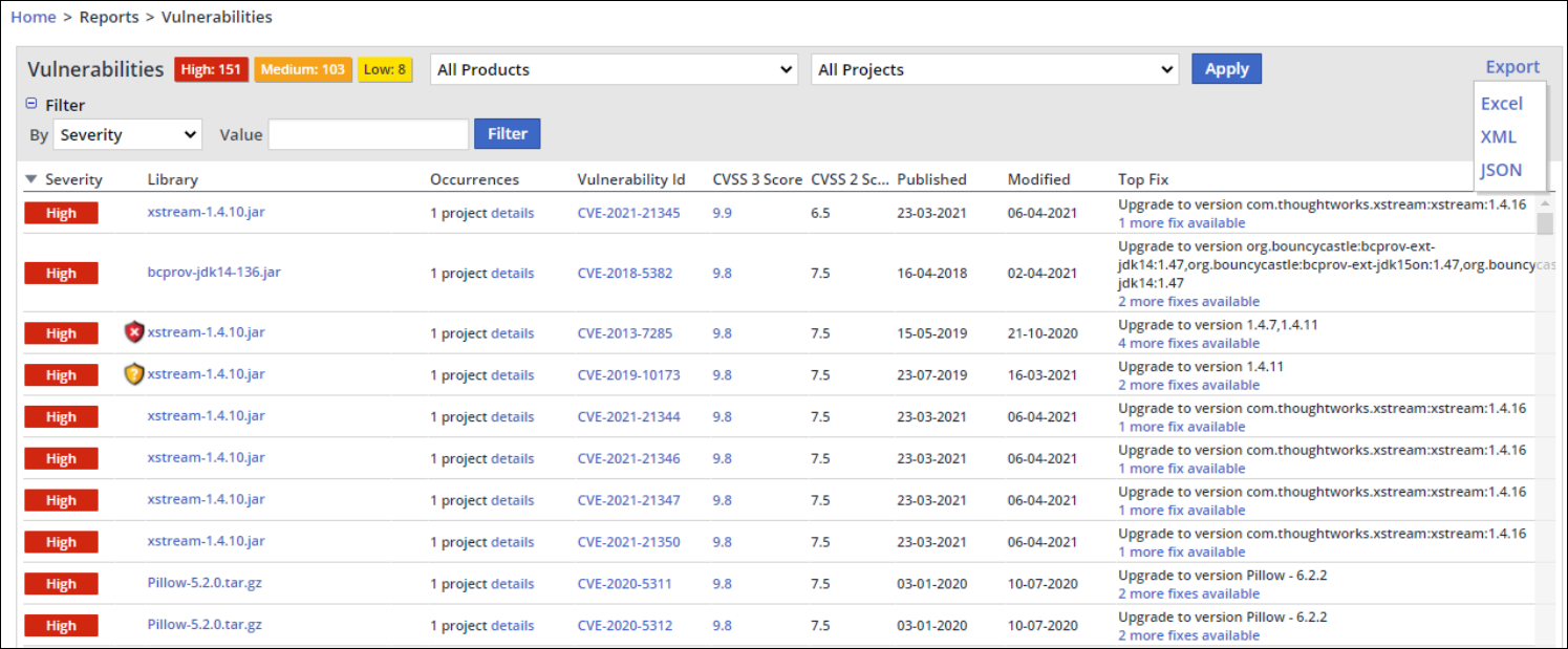 The Vulnerabilities Report contains all relevant information about your vulnerabilities, such as, severities, number of occurrences, libraries which were found vulnerable, and so on.