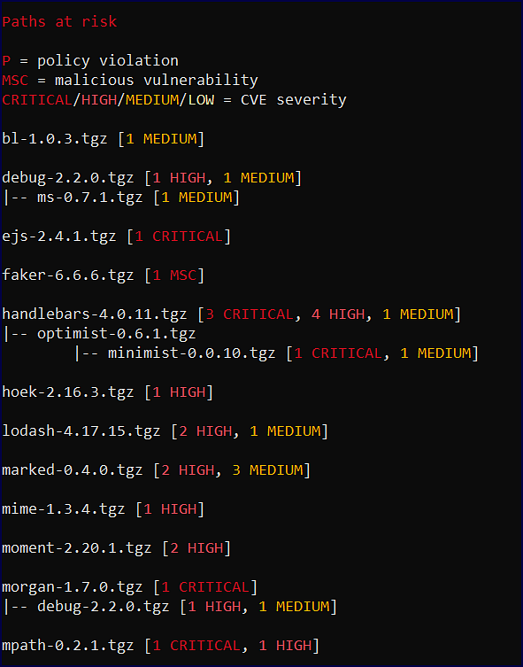 The “Paths at risk” provides a visual hierarchy of the dependency paths within your project that are affected by a policy violation (P), malicious vulnerability (MSC), or a CVE vulnerability: