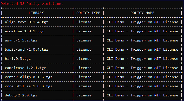 If the Mend CLI scan scope falls under your policy created in the Mend Application, the Mend CLI will print out any violations found in the terminal:
