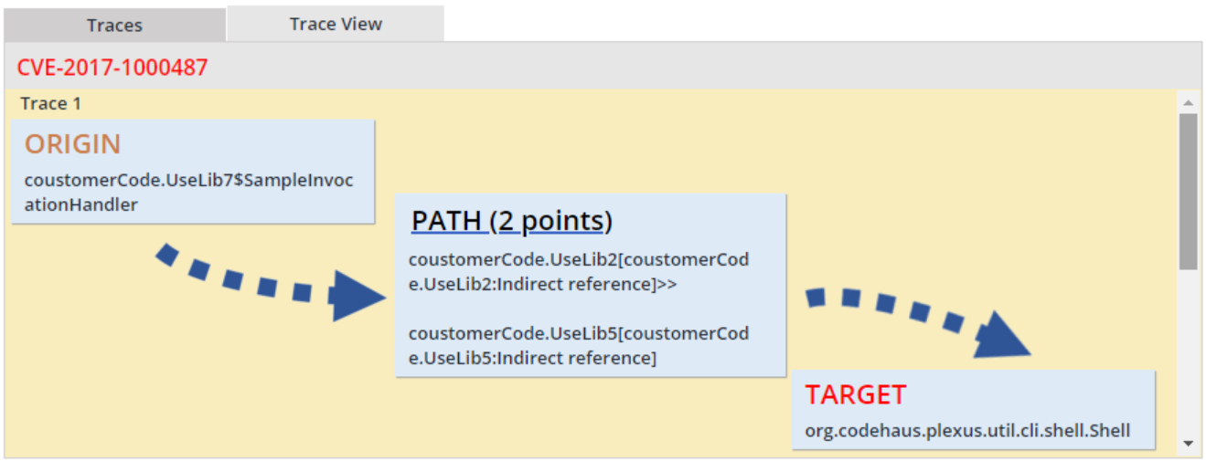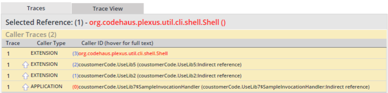Traces View - This tabbed view lists call traces pertaining to a reference selected in the Found Reference view next to it. The Traces view lists per each reference two elements at minimum – an Origin (proprietary code whence the call trace originated) and a Target (open source code associated with the reported vulnerability). If the Target is not called directly by the Origin, then additional calls will be featured in the Traces view, as warranted. If multiple traces were found, all traces will be featured in the Traces table and can be reviewed by scrolling the view. The table featured in the Traces view provides for each found trace call the following details: trace number; an arrow denoting the code called by the code in a given trace row; the caller type (APPLICATION - the proprietary code) or EXTENSION (the non-proprietary code)); and the caller identifier along with the file name and code line number. The user can elect to display a graphical view of the call trace by selecting the Trace View tab. The display presents the call trace from the Origin to the Target through a path consisting of any interim steps. The user may expand or collapse the displayed path by clicking on it.