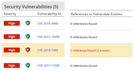Security Vulnerability Table - In this table, the References to Vulnerable Entities column details (per a selected vulnerability) the number of references and code traces that Mend Prioritize found to exist from proprietary code to component code associated with the pertinent vulnerability. Additionally, a corresponding shield will be placed next to the vulnerability ID and the references details will be displayed in the Found References view beneath this table.