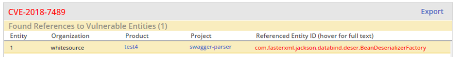 Found Reference View - This view lists references found by Mend Prioritize to exist from proprietary code to open source code for a given security vulnerability selected in the Security Vulnerabilities table. Per each reference the following details will be displayed in independent rows: Organization, Product and Project related to the relevant proprietary code, and the identifier and type of the referenced open-source code featuring the reported vulnerability.