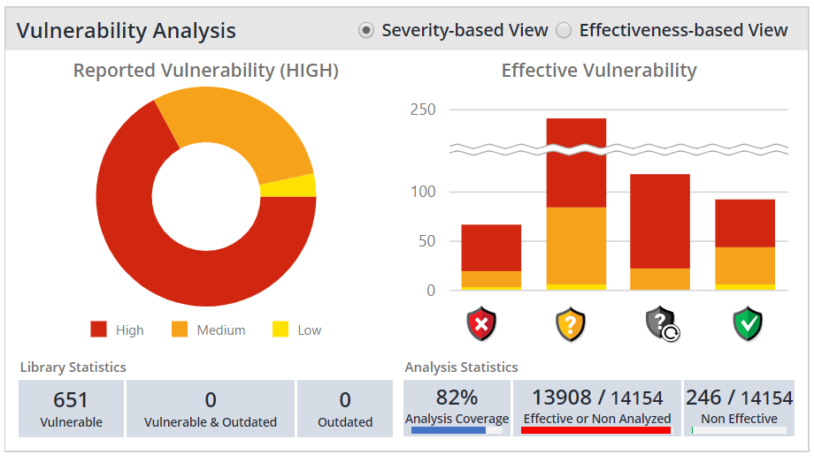 Severity-based View - Vulnerability Effectiveness: the distribution of security alerts marked with a red, yellow, gray or green shield, accounting for reported vulnerability severity. The vulnerabilities with a reported severity are marked using the same colors denoting the severity on the Reported Library Vulnerability chart.