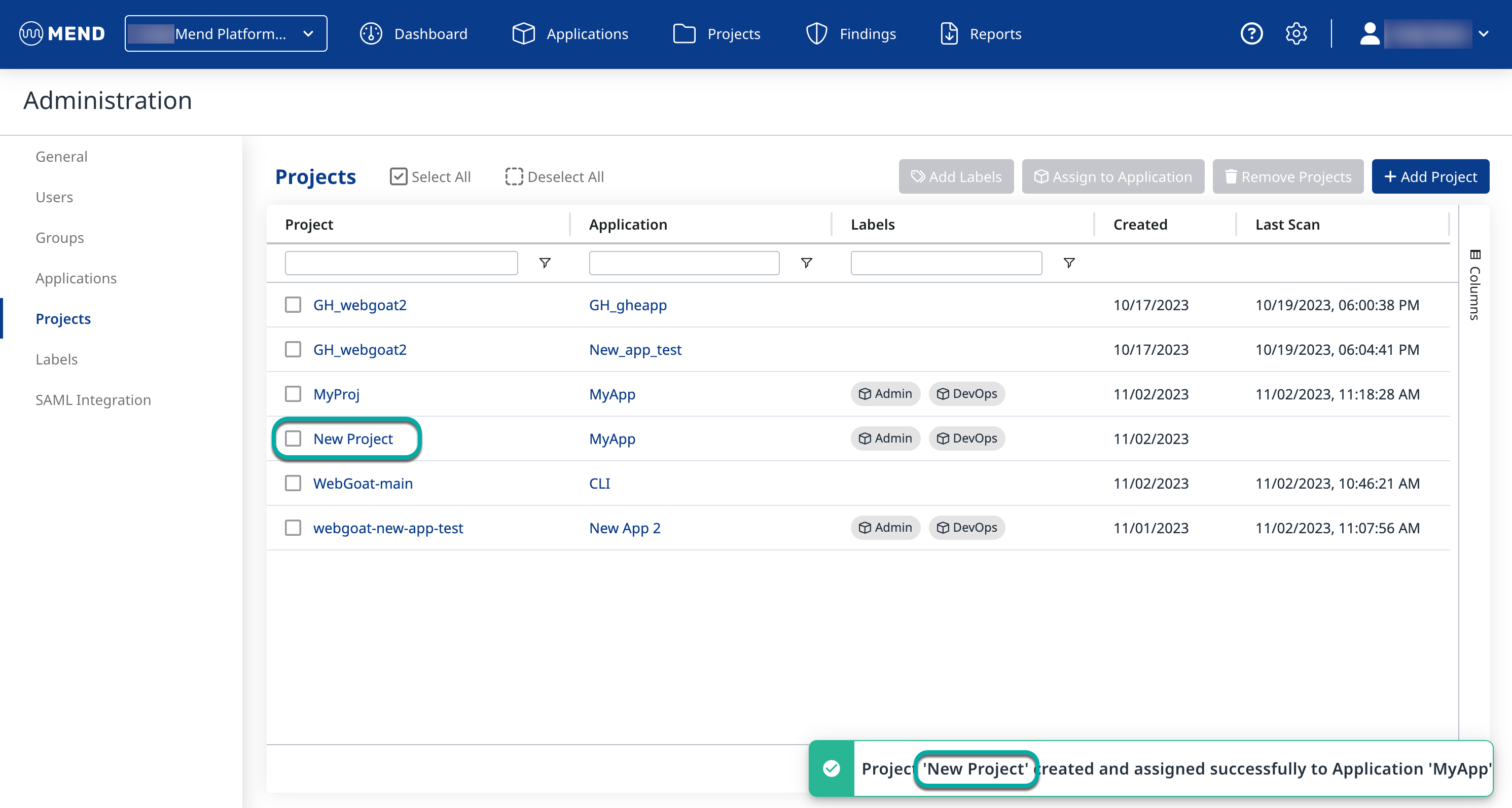 As an Admin of the account, you can create new Projects. This can be done in the Mend Platform's Administration menu. This article will provide the details for creating new Projects.
