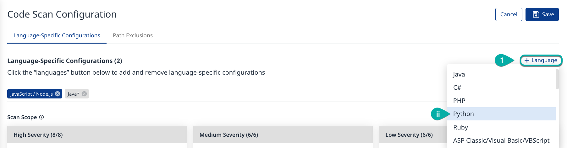 The Code Scan Configuration page has two tabs: the Language-Specific Configuration tab and the Path Exclusions tab. The Language-Specific Configuration tab is the default tab. It is divided into the Language-Specific Configuration section, and for each language, you have six sections to fine-tune the analysis behavior: