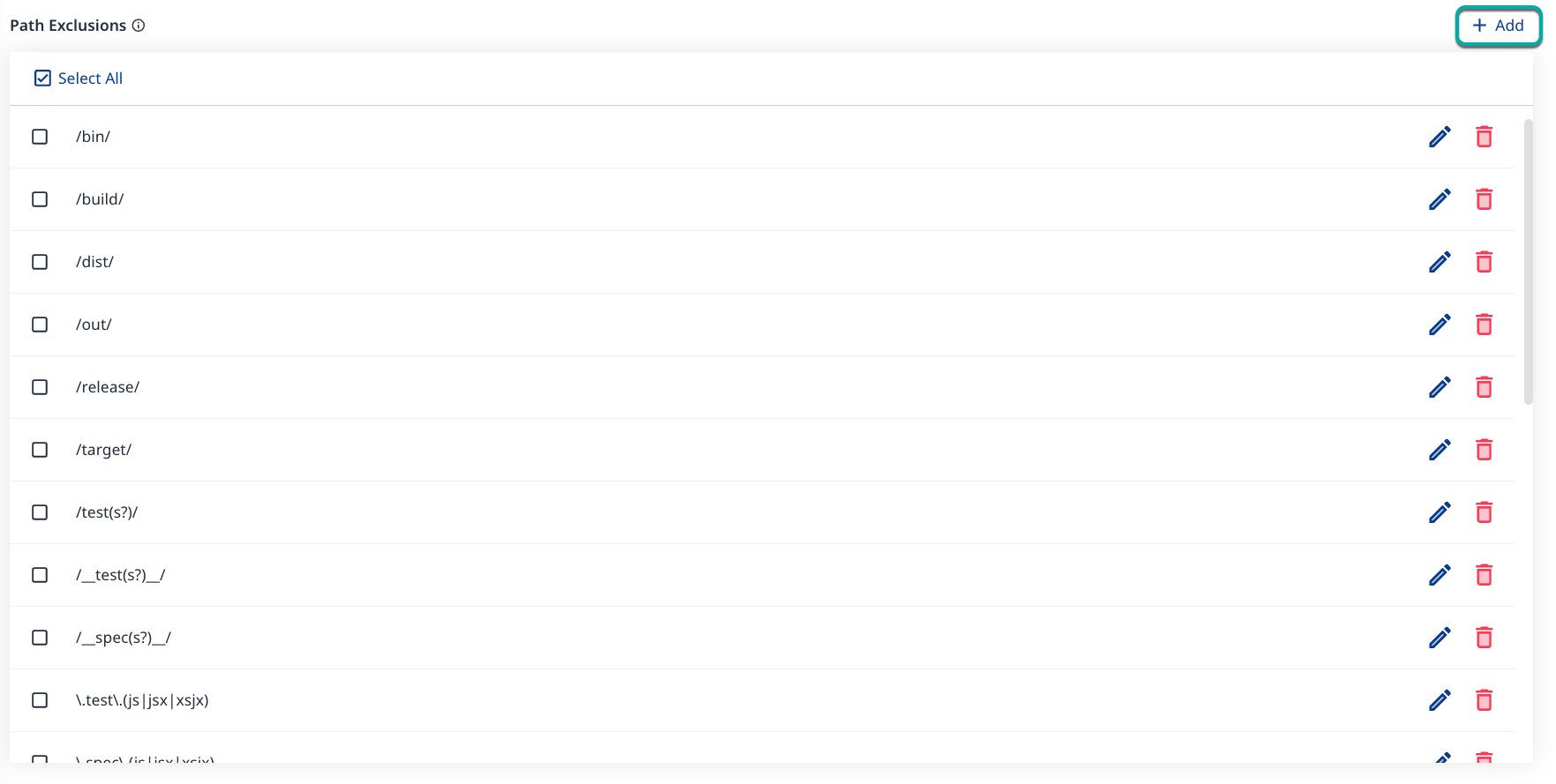 The Path Exclusions section provides the ability to add, remove, or modify Paths that will be ignored by the Code Scan.