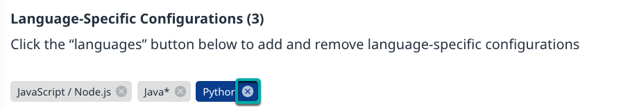 The Language-Specific Configurations section allows you to add or remove the programming languages you want to scan for. The selected programming languages determine which CWEs are available in the Scope, the Predefined Taint Sources, and which CWE Types are available for Custom Taint Sinks.