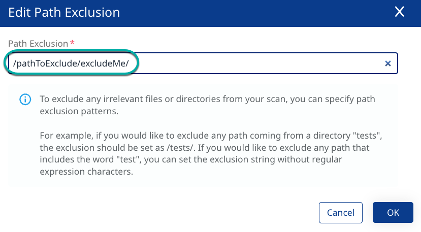 Click + Add in the top right of the Path Exclusions widget. The Add Path Exclusion dialog box will appear.