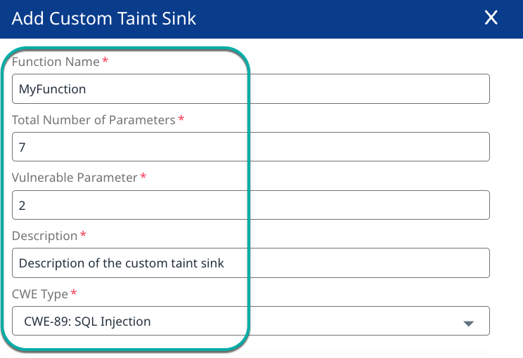 All fields are mandatory.Function Name: The name of the custom taint sanitizer function.