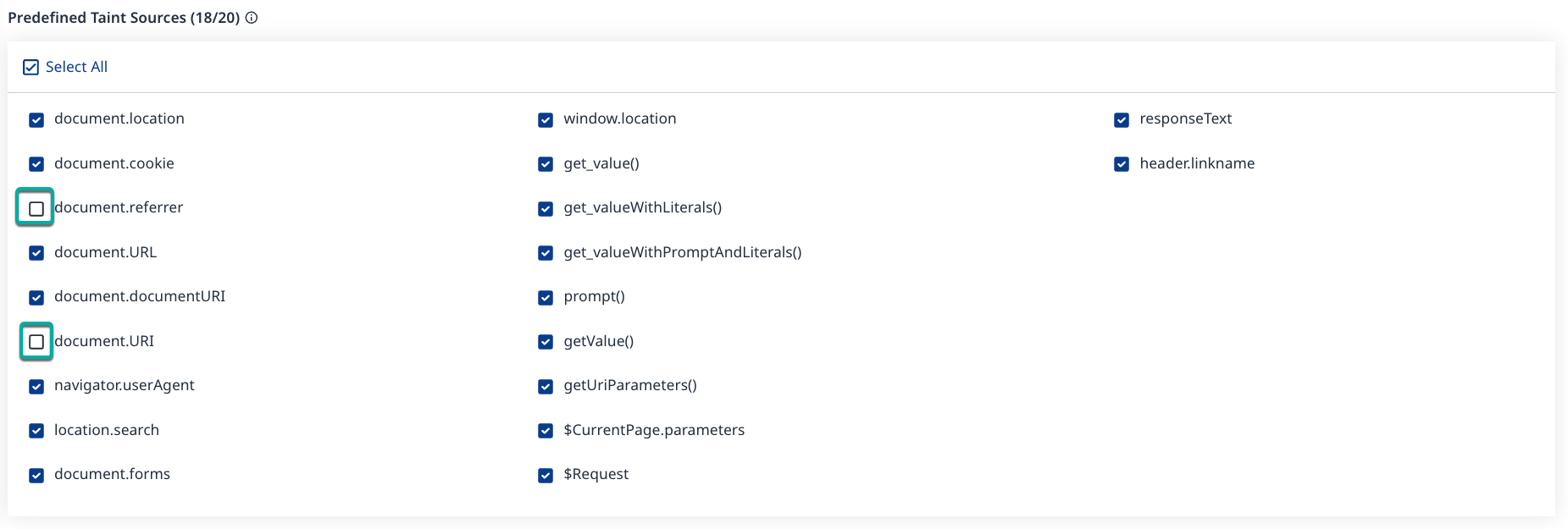 The Predefined Taint Sources section lists all the Taint Sources identified by Mend for the currently selected language in the Language-Specific Configuration section. By default, all Predefined Taint Sources are enabled.