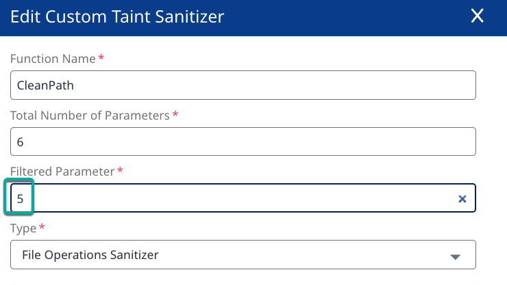 Type: A dropdown list to select the Sanitizer type the custom taint sanitizer function is for. Sanitizers are specific for certain vulnerability types.