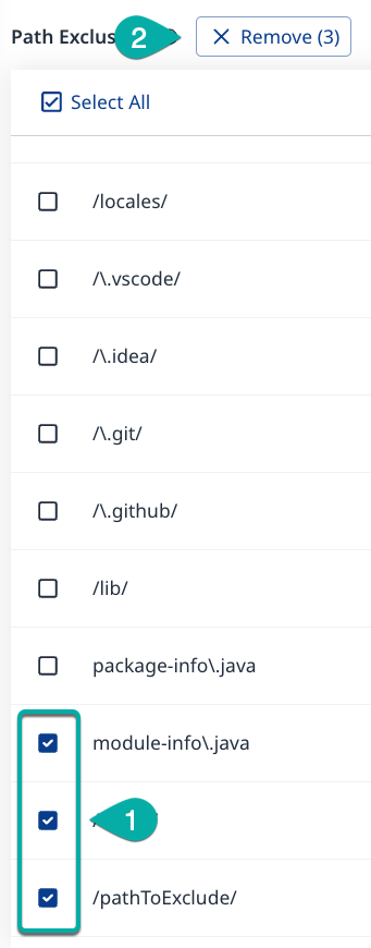 Check the boxes next to the excluded Paths you want to remove. The Remove button will appear next to the Path Exclusions widget title.
