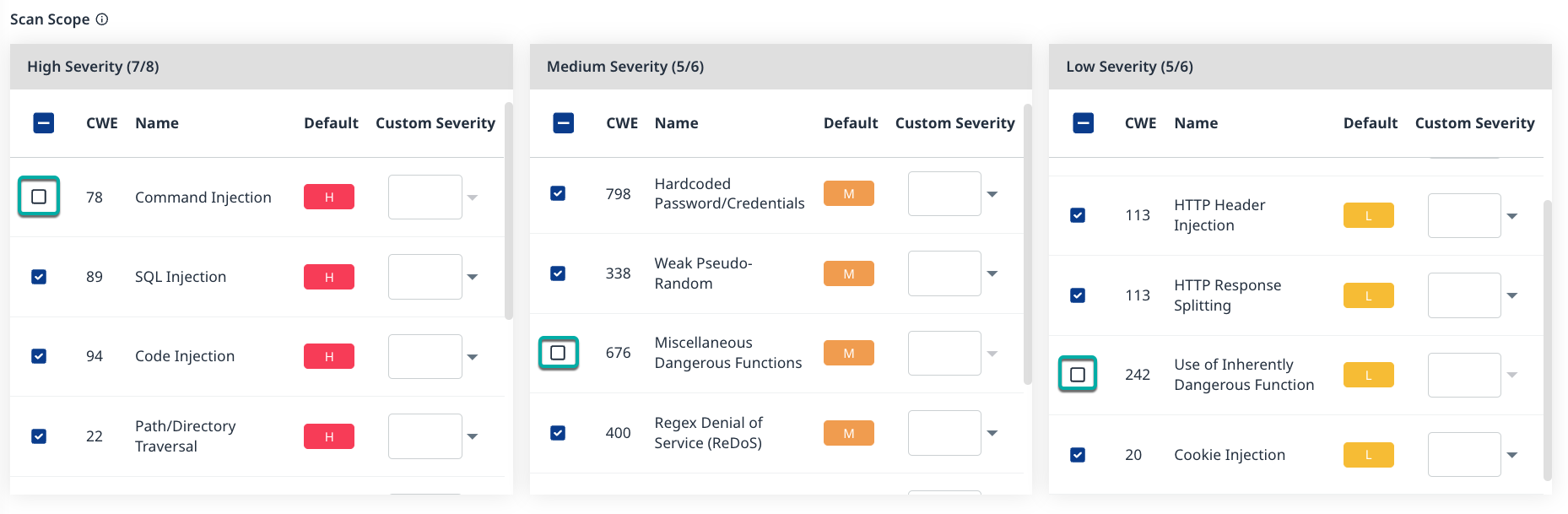 The Scan Scope section is divided into three severity widgets, High, Medium, and Low, and allows you to determine the CWEs (Common Weakness Enumeration) that the Code Scans should check for and customize the severity level assigned to them. By default, all CWEs are enabled.