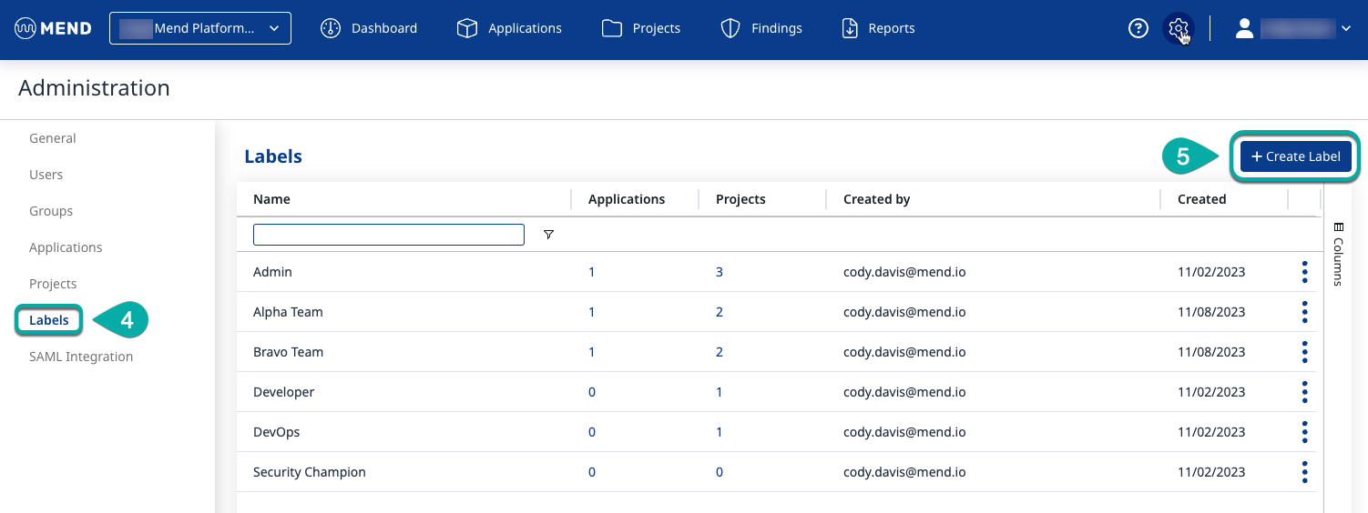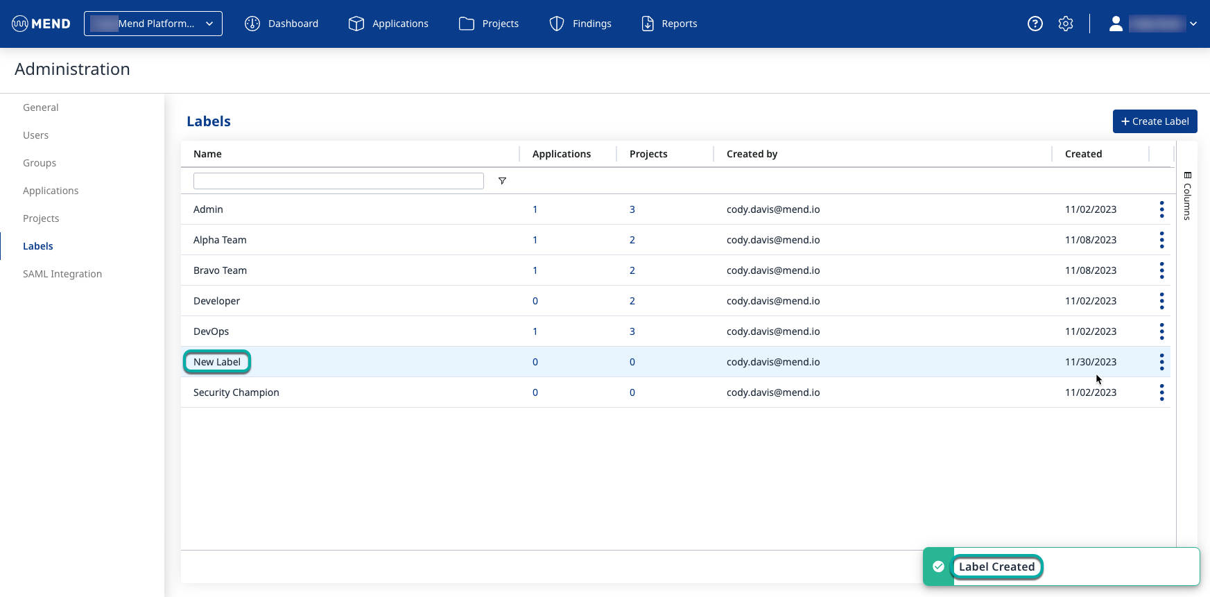 Creating Labels for your Organization will allow you to assign them to Applications and Projects. The purpose of assigning Labels to Applications and Projects is to use the labels to filter for the findings within Applications and Projects assigned to specific Labels and review and report just those findings.