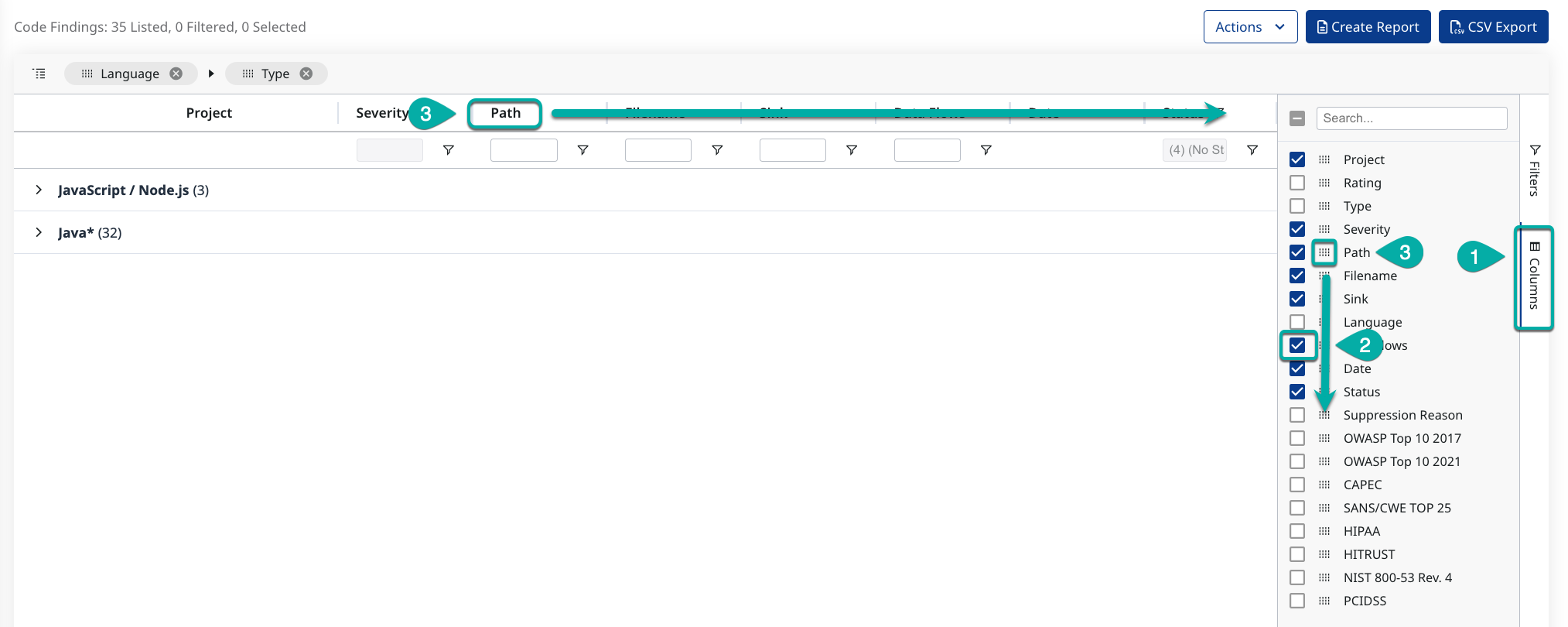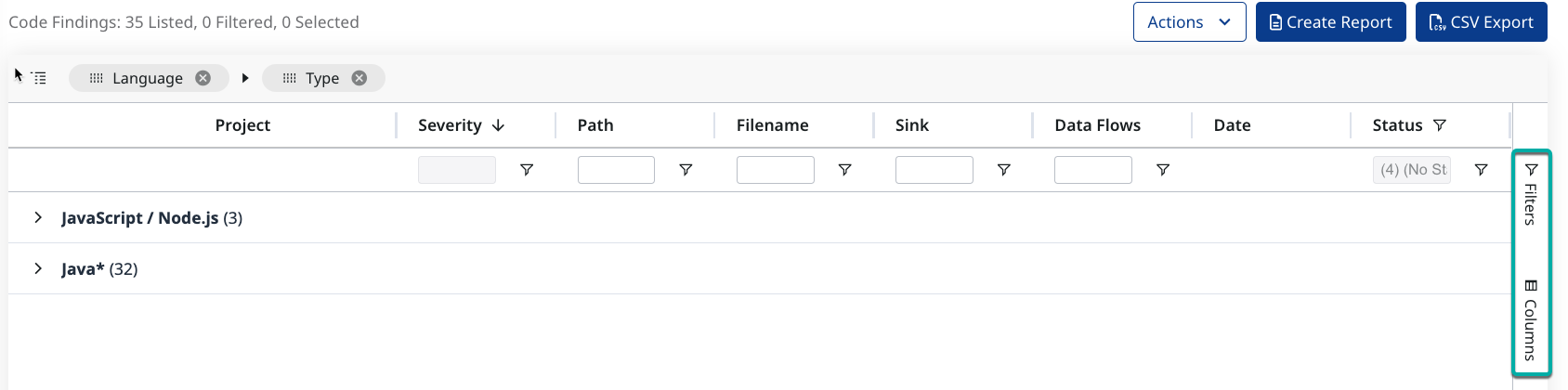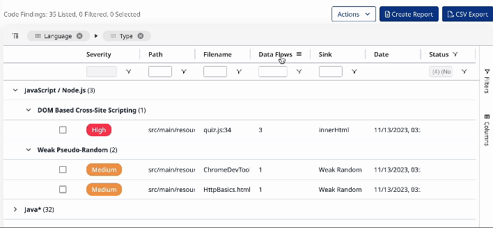 As a Security Champion or AppSec manager, you will export Reports with the security findings from the Applications and Projects within your Organizaion. You will want to add new columns and filters to the findings pages to create the Reports that best fit your needs.