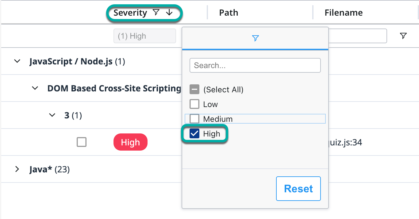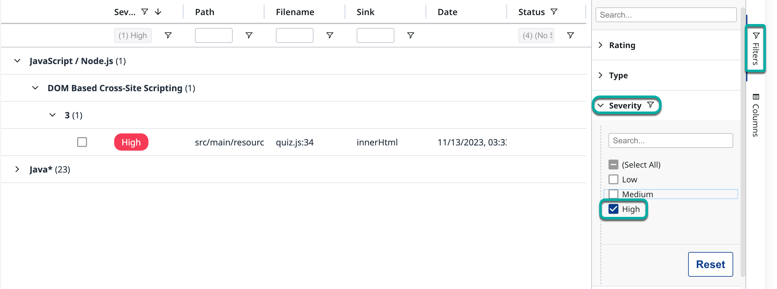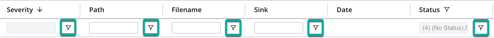 Click the filter icon under each column name or the Filters button on the right side of the table. The list of available filters to add will appear on the right side of the findings table. Each filter corresponds to the column of the same name.