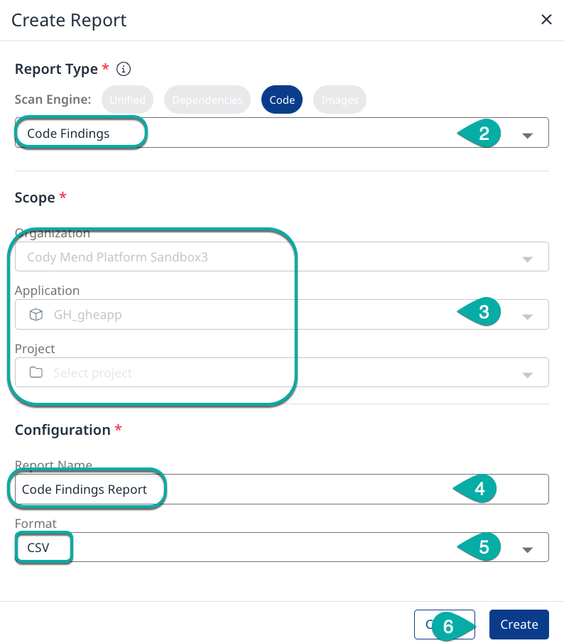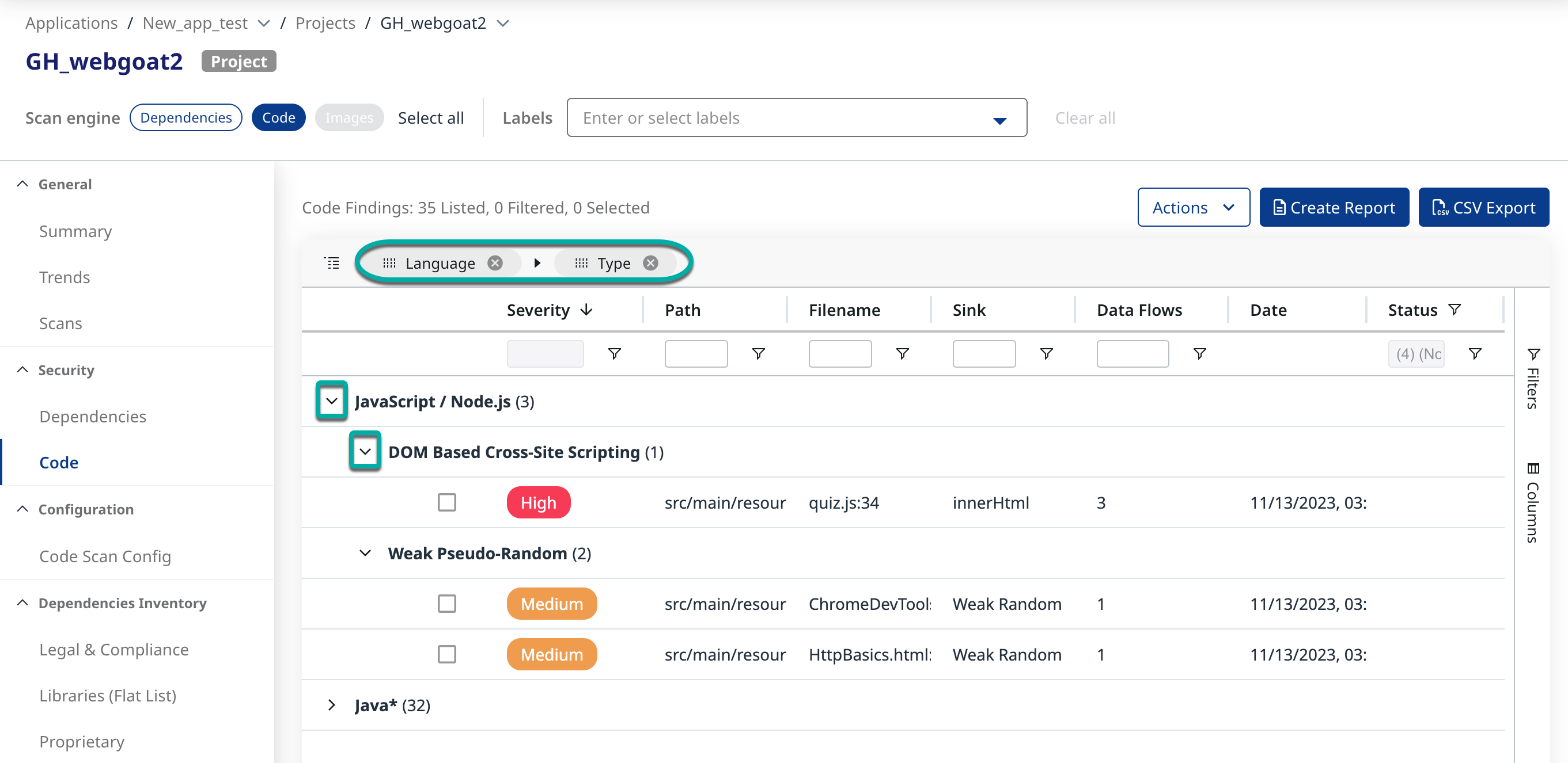 There are two options for extracting the findings data: Create a Report and Export to CSV. From an Applications or Projects summary page, the Dependency, Code, Legal & Compliance, and Libraries (Flat List) pages have the option for CSV Export, with the Code page also having the option to Create Report.