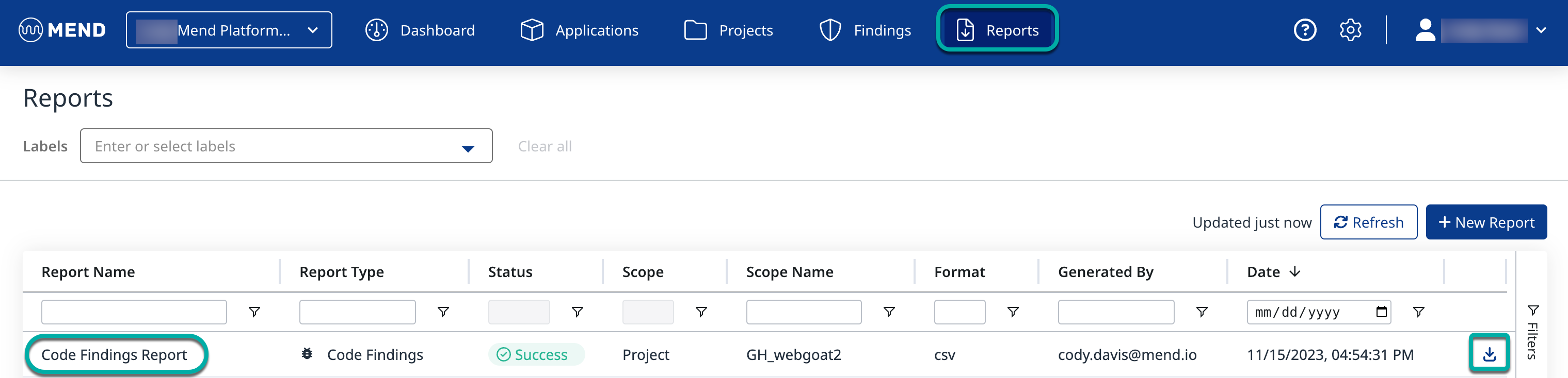 To view the generated report, you must navigate to the Mend Platform's Reports page.
