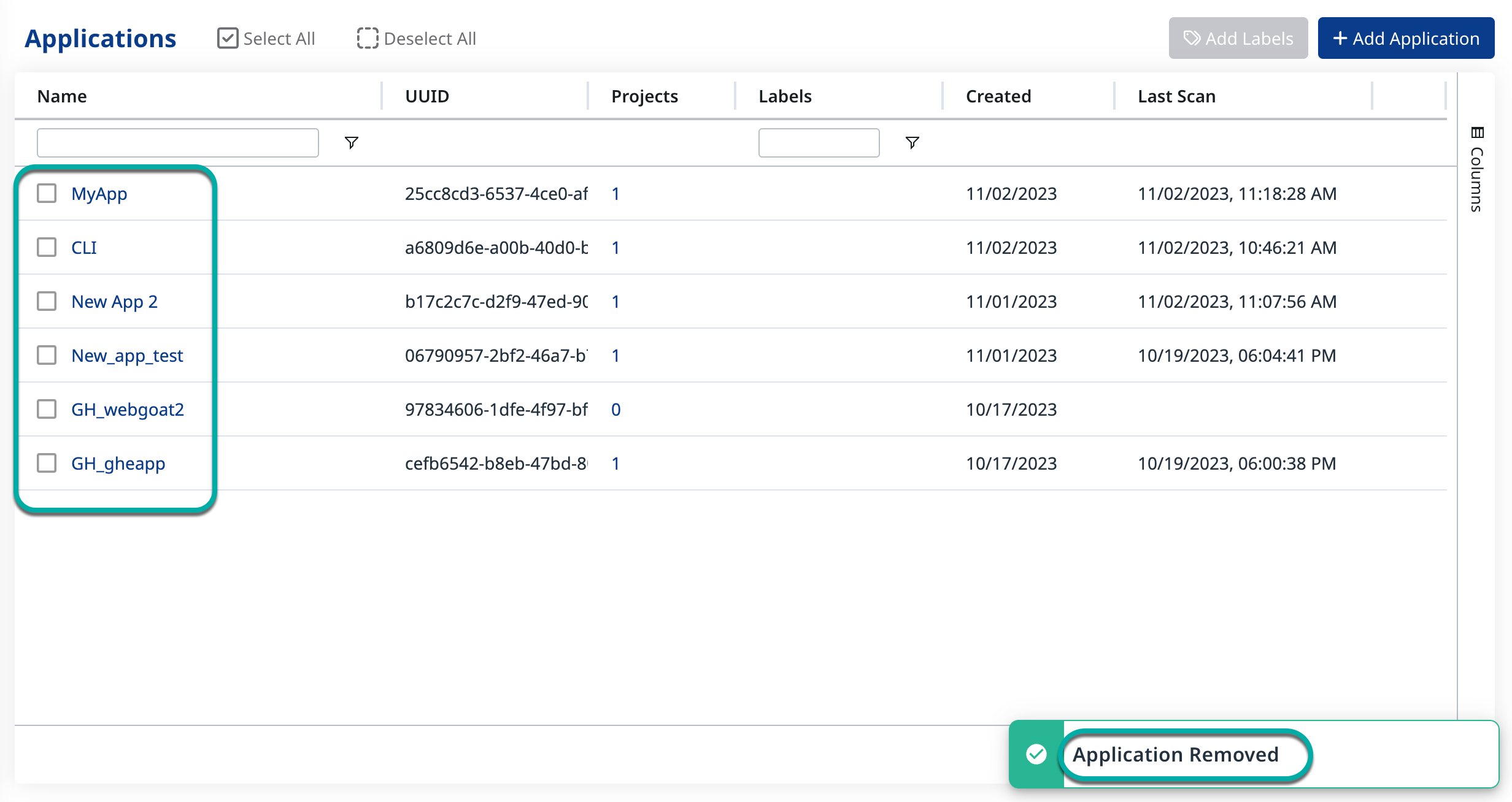 The Application will be removed from the Application table, and you will see a notification in the bottom right corner of the window.