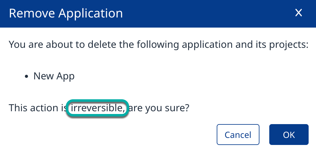Click the trash can icon. A pop-up window will appear to confirm the removal of the Application and warn that deleting Applications is irreversible.