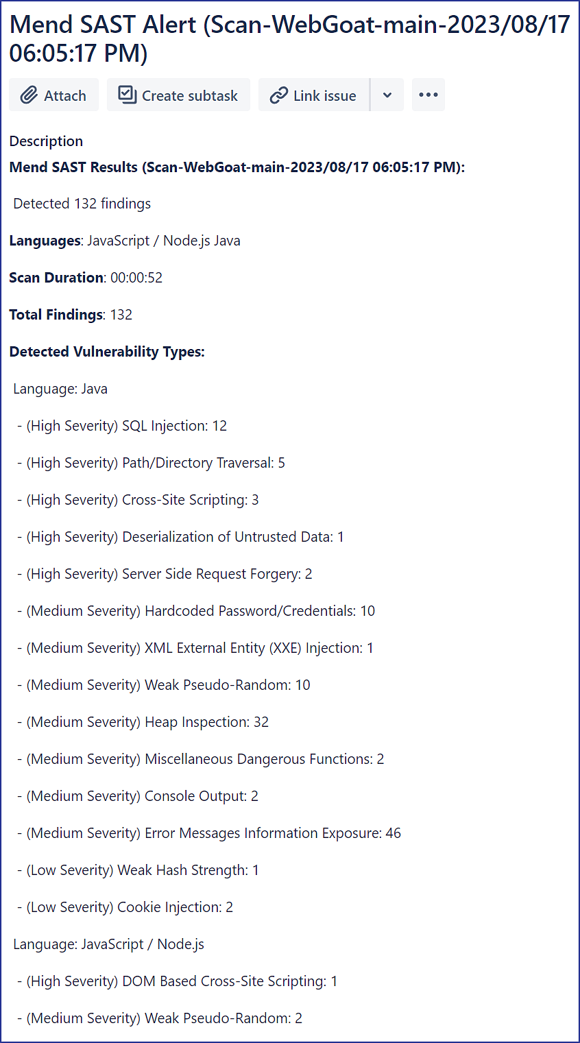 The Mend for Jira plugin opens a “Mend SAST Alert” Jira issue within your integrated Jira project(s) that contains a summary of the detected scan findings relevant to the Mend scopes and policies mapped: