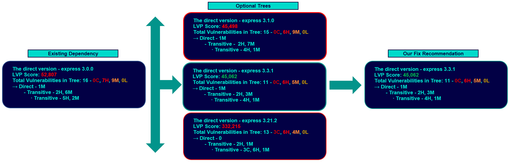 Adding up, express v3.0.0’s dependency tree has a total of 16 vulnerabilities, 7 High and 9 Medium. We then compare all other minor 3.x versions of express against v3.0.0 using our risk-scoring equation to determine the least vulnerable dependency tree. Let’s look at a visual of the scoring and decision-making below: