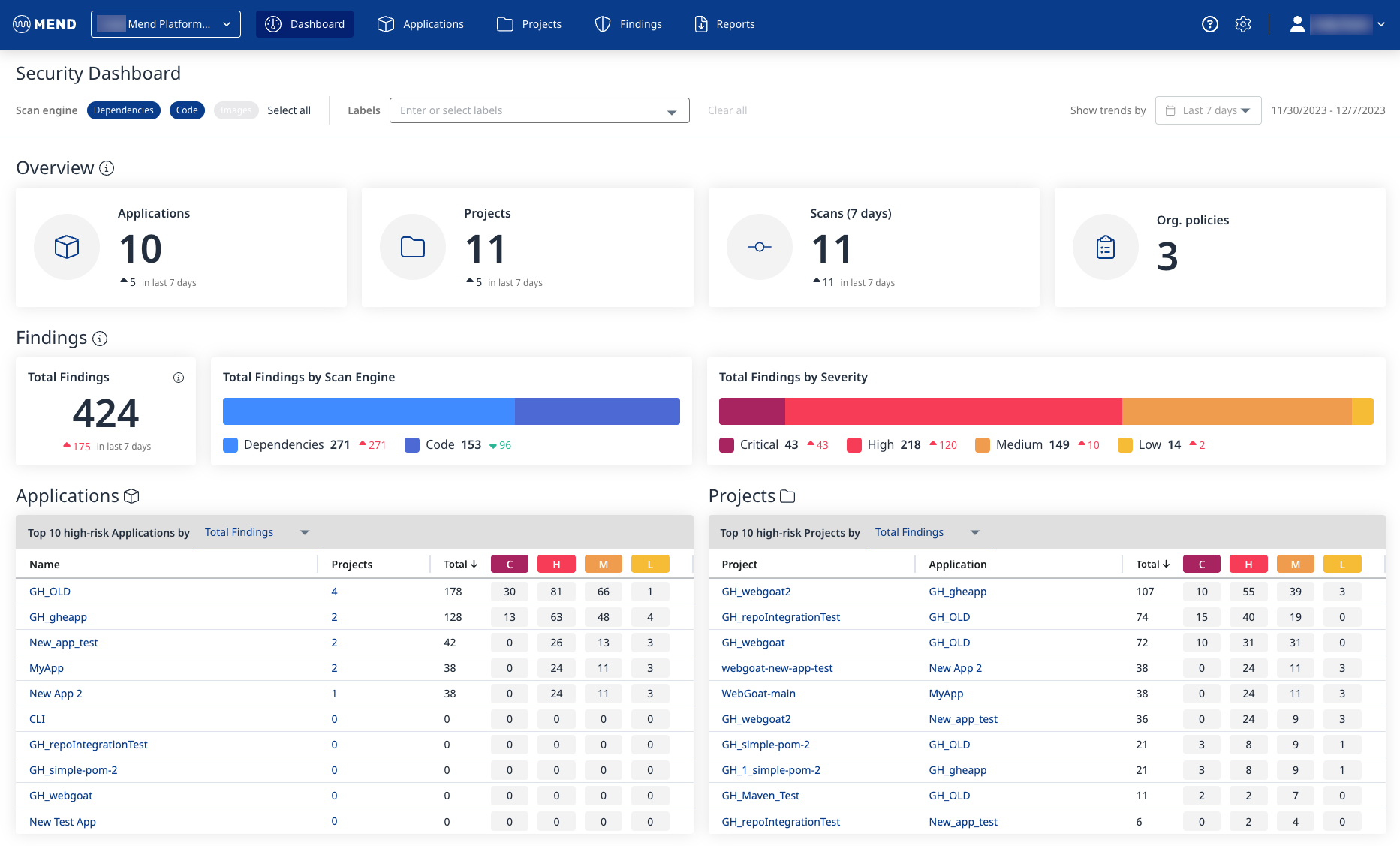 The Mend Platform Security Dashboard provides a high-level overview and analytics for SCA, SAST, and IMAGE scan findings across your entire Organization.